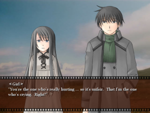 Soviel zur Story, nun zum visuellen Aspekt. Zunächst fällt einem auf, dass das Werk fast vollkommen aus monochromen Farben besteht, was selbstverständlich so intendiert war. Durch die Absenz jeglicher Farben wird eine mysteriöse, aber dennoch keine erdrückende Atmosphäre geschaffen, außer natürlich in den Szenen wo eine bewusst erzeugt wird. Die fehlenden Farben haben zudem den Vorteil, dass die Hintergründe, die eigentlich Fotografien sind, (wie es bei Sound Novels oft der Fall ist) sich perfekt dem gezeichneten Stil der Charaktersprites oder der CGs anpassen.